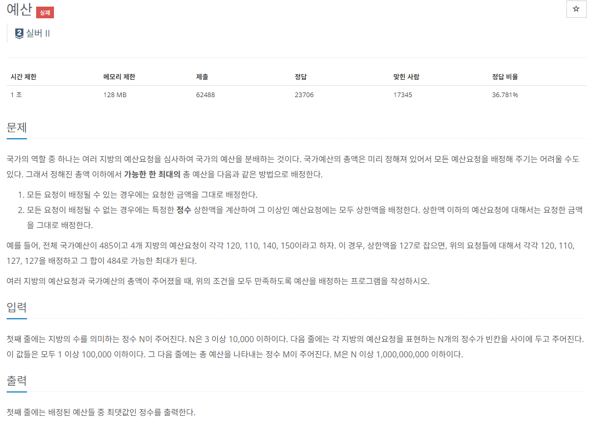 #그럼 budget을 다 더한 후 M과 비교해서 budget이 크면 max(budget) = 상한액 - 1을 계속 한다.