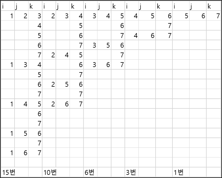 i = 1일때 j = 2일때 k = 3, 4, 5, 6, 7