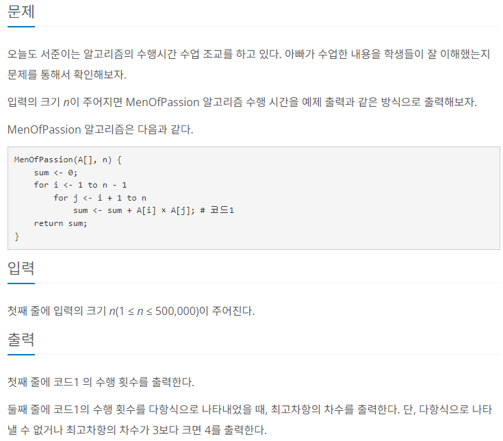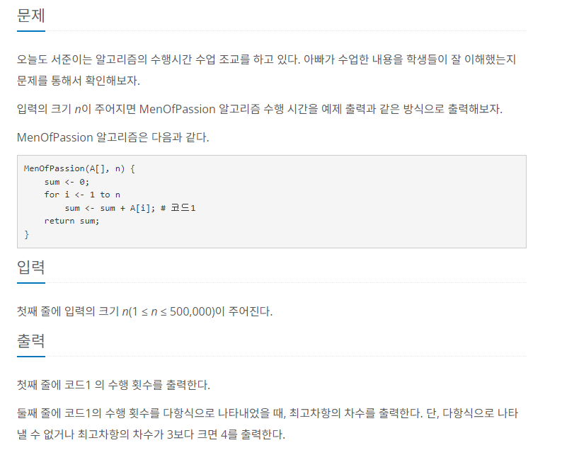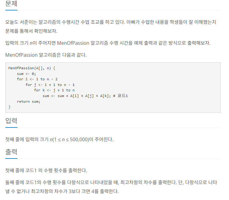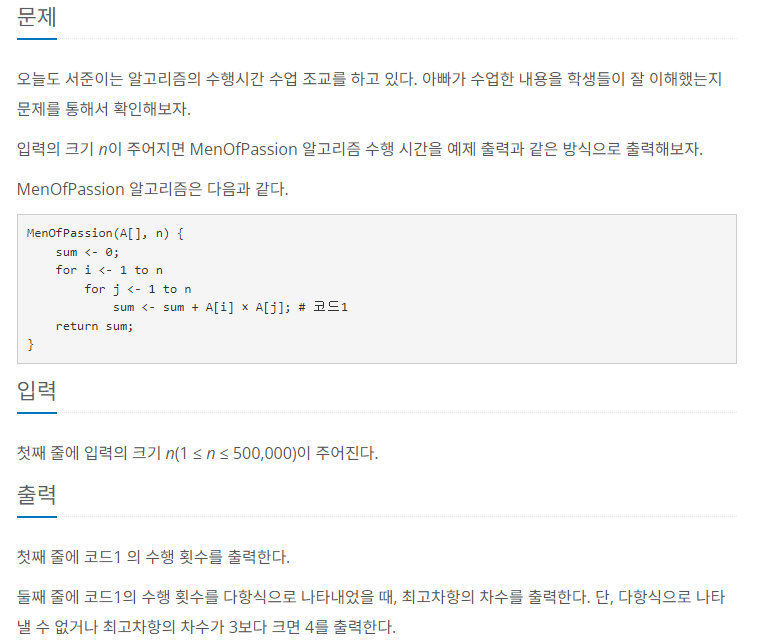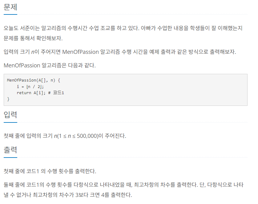 이 문제는 변수 n을 받아서 MenofPassion에서 코드가 실행될때 출력값이 속도가 n의 값에 따라서 시간 복잡도가 어떻게 되는지를 물어보는 문제이다.
