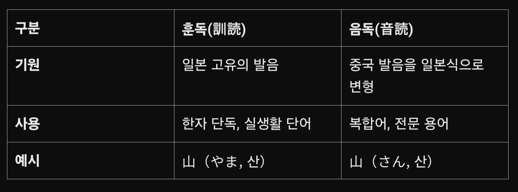 일본어에서 **훈독(訓読)**과 **음독(音読)**은 한자를 읽는 두 가지 방법입니다. 이 두 가지 방식은 일본어에서 한자를 받아들이는 과정에서 생긴 독특한 체계입니다. 아래에서 자세히 설명드릴게요.