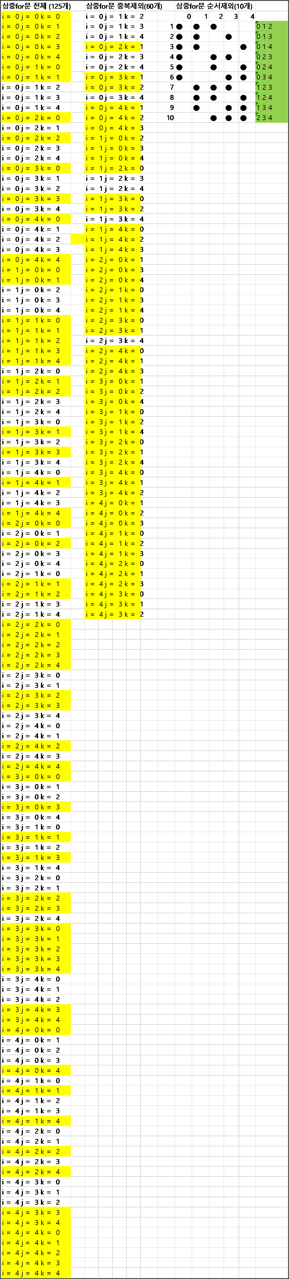 첫번째로 내가 작성한 3중 for문은 모든 인덱스를 매칭시키는 방법이다. 즉, range(5)가 3번 반복되면 총 125개의 경우의 수가 나온다.