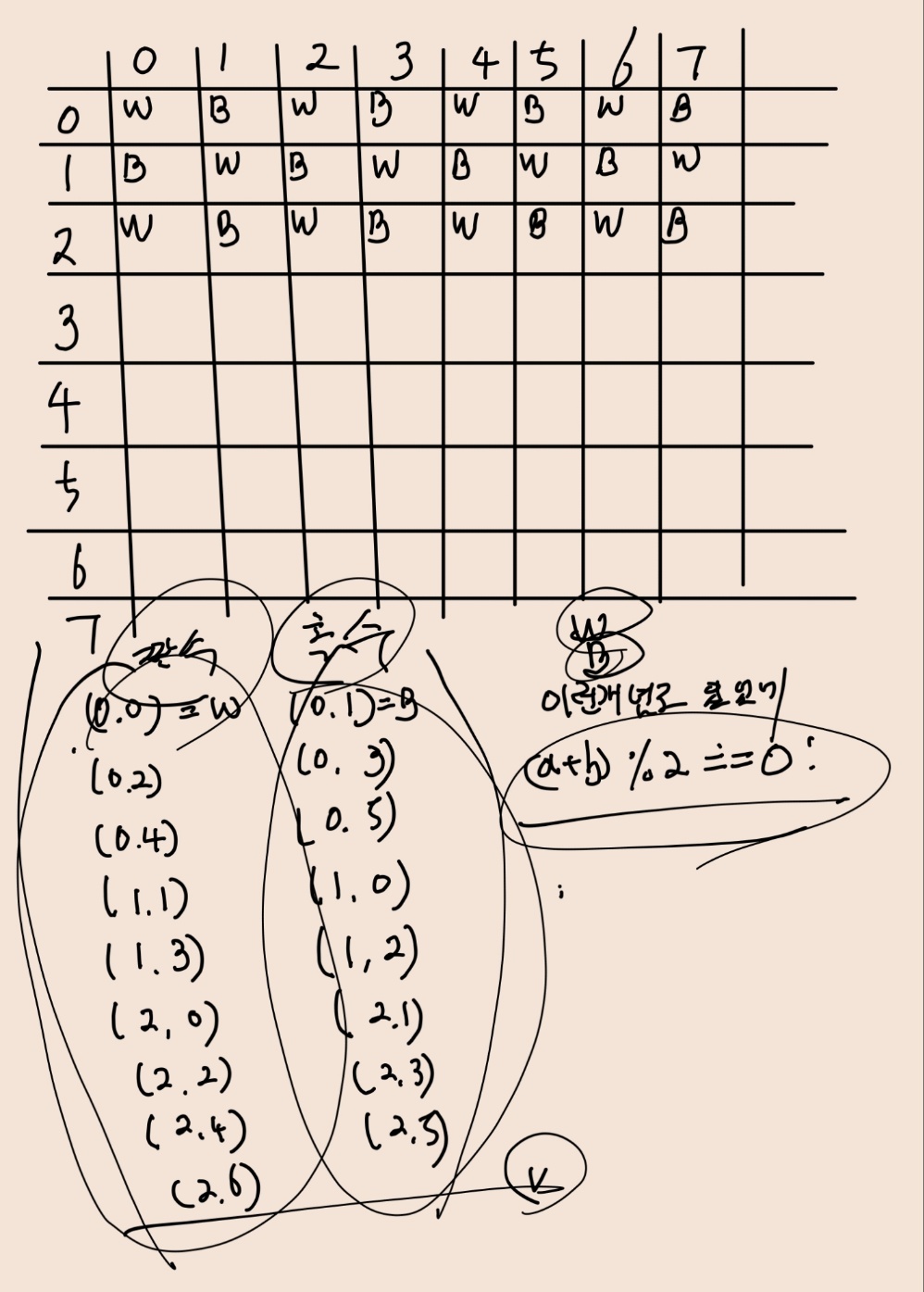 1. 각 x, y의 값의 합이 짝수 / 홀수에 따라 W와 B가 나뉘는걸 볼 수 있다. => 내가 스스로 풀때는 이 개념을 찾지 못함.
