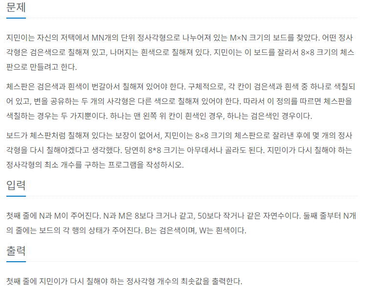 2. 입력받은 배열을 계산해서 out of range가 안되도록 N - 8 + 1 / M - 8 + 1 범위를 만들어 준다.