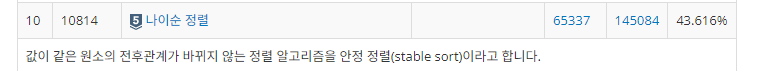 설명에 안정 정렬(stable sort)라고 되어 있는데 처음 들어보는 용어다. => 이게 뭘까???