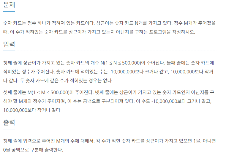 숫자카드의 범위는 -10,000,000 <= X <= 10,000,000이라서 해당 숫자가 나오면 시간 복잡도를 꼭 생각해야한다.