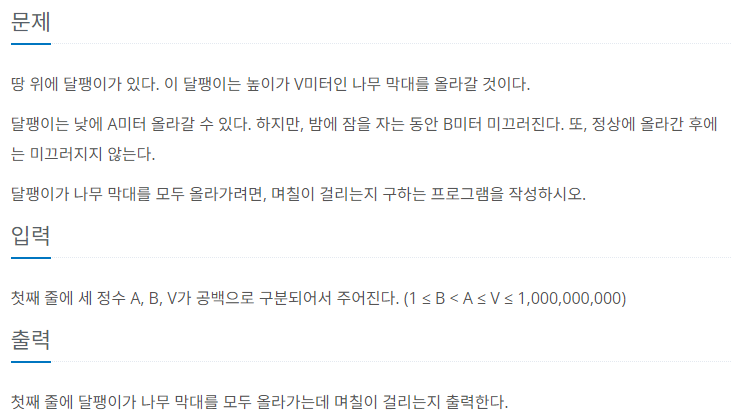 다시 바꾸면 x = V - B / A - B ==> 초반에 올라가야할 거리가 V - B라고 했는데 이거다. 근데 이게 왜 올라가야할 거리지?