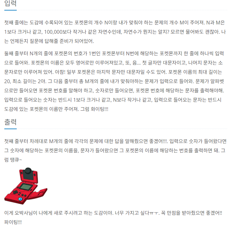 결론은 도감에 수록되어 있는 몬스터들이 있다. 그 다음 문제로 내는 몬스터 이름과 숫자가 도감에 있는지 여부 및 출력하는 것이다.