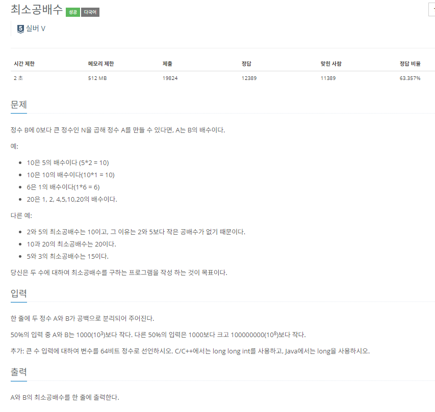 바로 직전에 1934번 최소공배수 문제를 풀었으면 금방 풀 수 있다. > 문제중 큰 수 입력에 대하여 변수를 64비트 정수로 선언하시오? 이게 무슨말이지??? 파이썬은 c언어처럼 변수의 크기를 할당하는게 없을텐데?'' 파이썬에는 해당 없음.