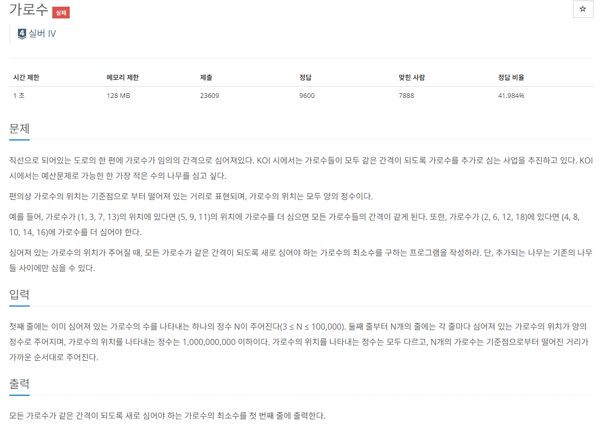 - 각 가로수 사이의 간격을 집합에 저장하고, 이 간격들의 최대공약수를 계산합니다.