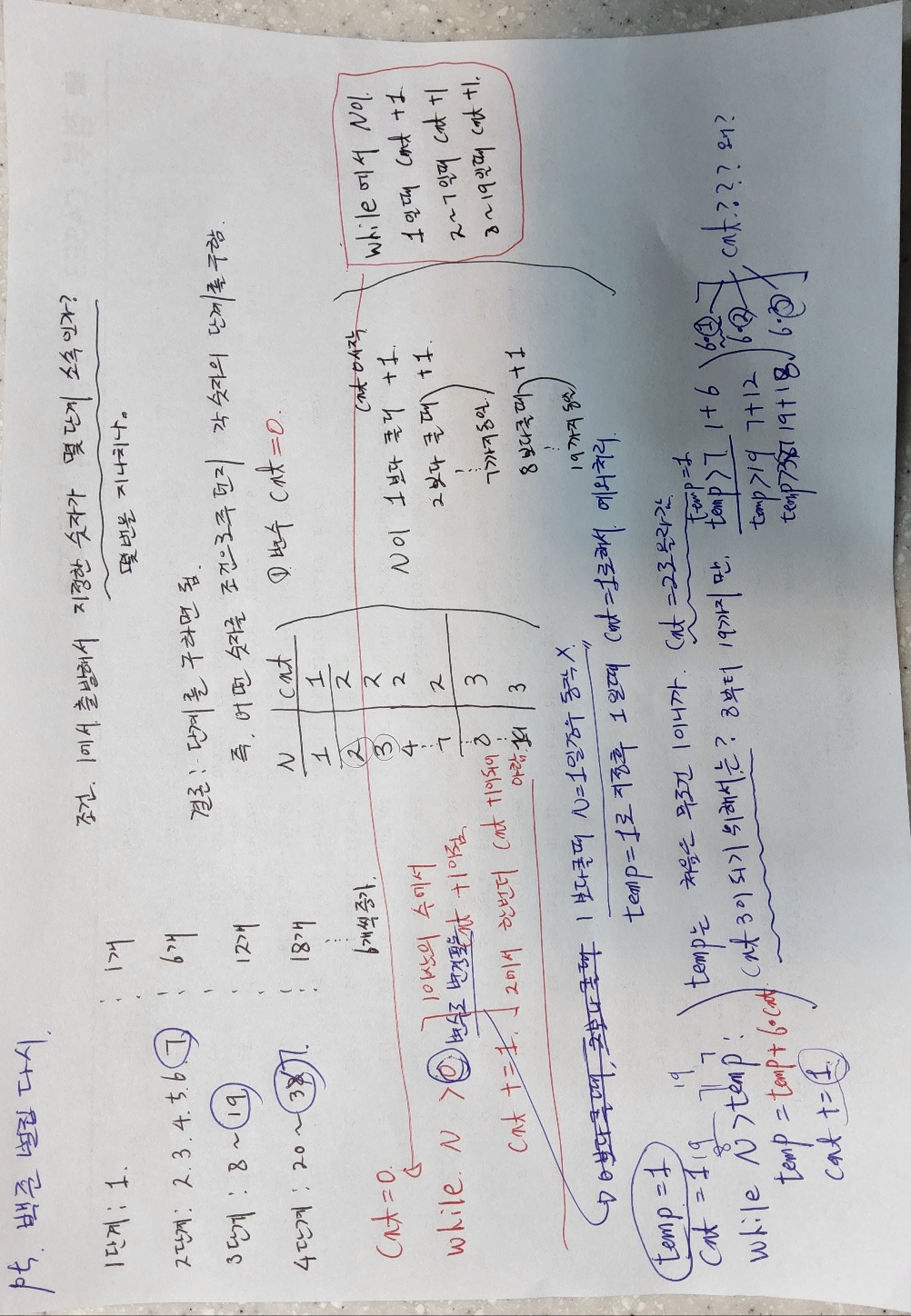 => 여기서 필요한 숫자는 temp += 6 * 를 하면 되고 1, 2, 3 반복은 circle이 구역에 맞게 +1씩 증가함으로 조건을 찾을 수 있음