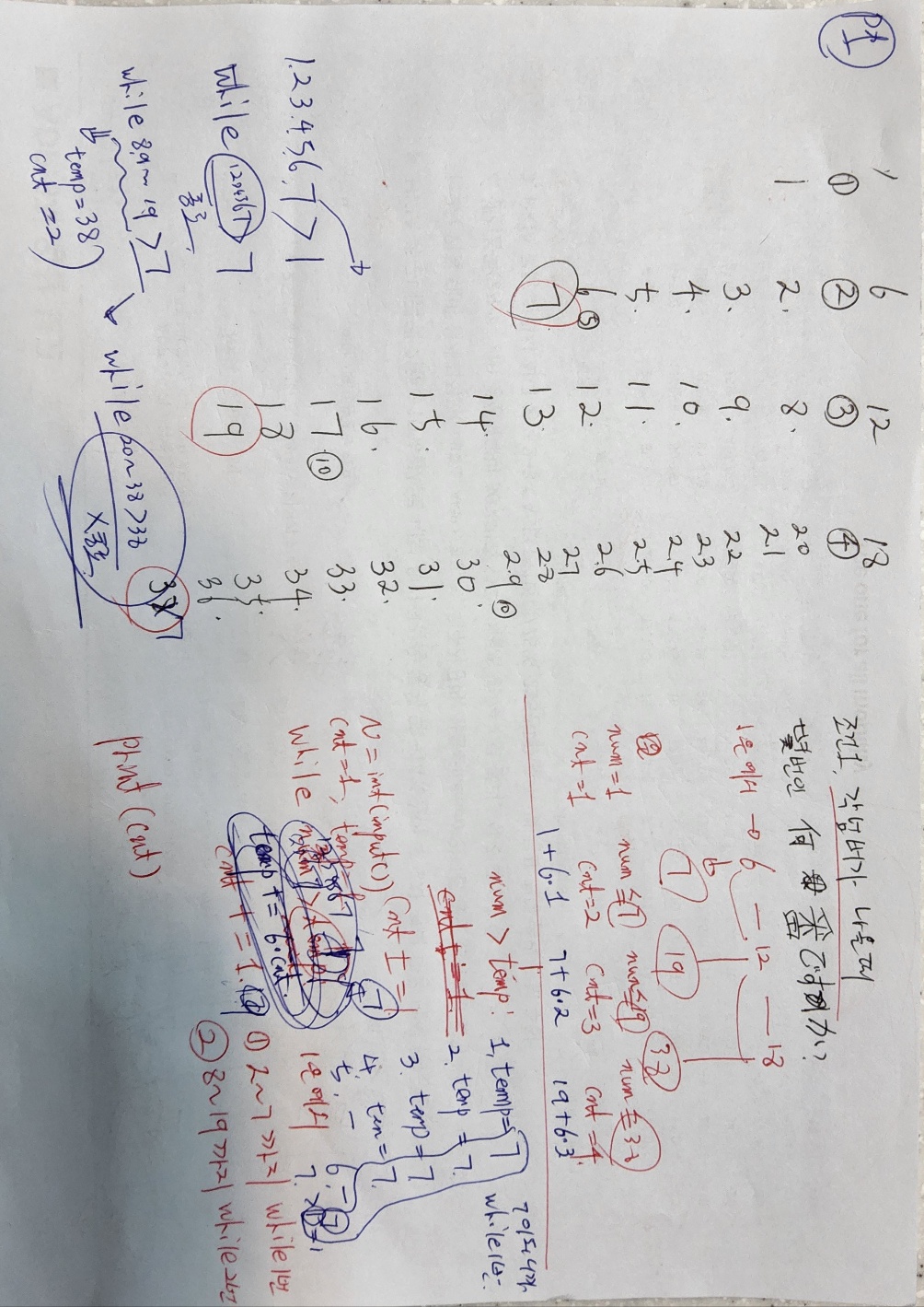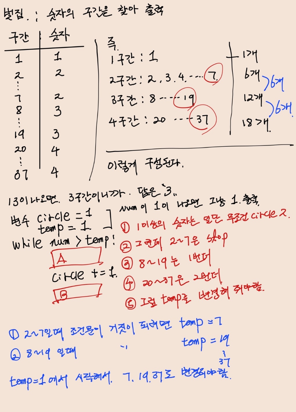 num이 8~19까지는 temp = 1일때 circle이 2가됨. => 다시 temp가 7이 나와서 circle이 3이 됨 => 다시 temp가 19가 나와야 while이 종료