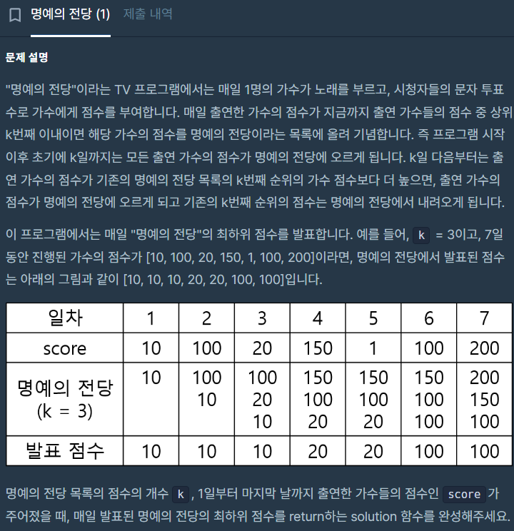 단, k값과 score의 길이가 같다면 명예의 전당에는 모든 score들이 들어가게 되는 것을 찾아야 한다.