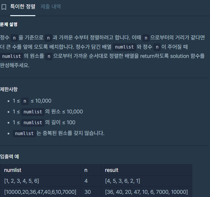 즉, n = 4일때 3과 5의 차이는 절대값 1임. 차이가 동일할 경우 큰수부터 나열하는 것이 기준임으로 5가 먼저 나와야 하는데 sort의 기본 배열은 오름 차순임으로 n - x를 해서 4 - 5 = -1, 4 - 3 = 1이라서 -1이 더 작은 수 임으로 5가 먼저 나오게됨.
