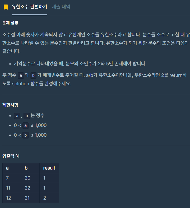 b가 1이 되면 그건 2와 5로만 나누어 떨어졌다는 의미니까 유한소수, 1이외의 나머지 값이 있으면 무한소수로 구분했다.