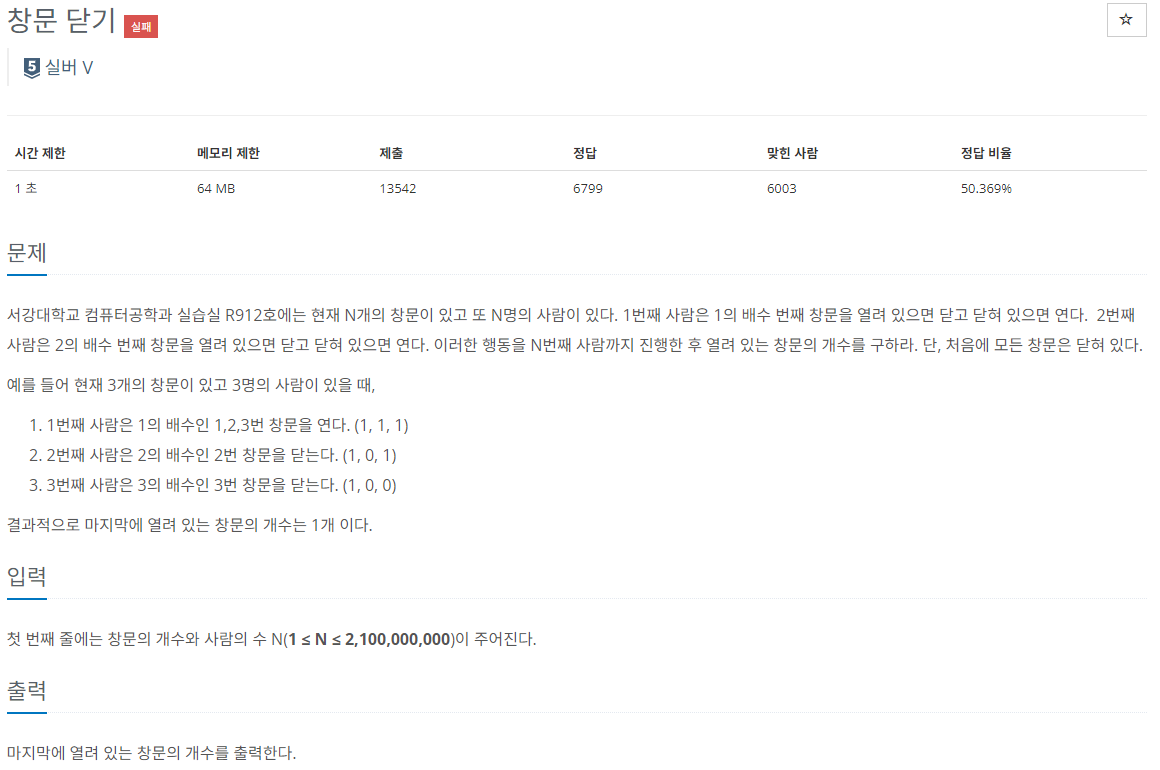 결국 X의 배수일때 기존에 창문이 닫혀 있으면 +1을 하고 열려있으면 -1을 하는 구조이다.