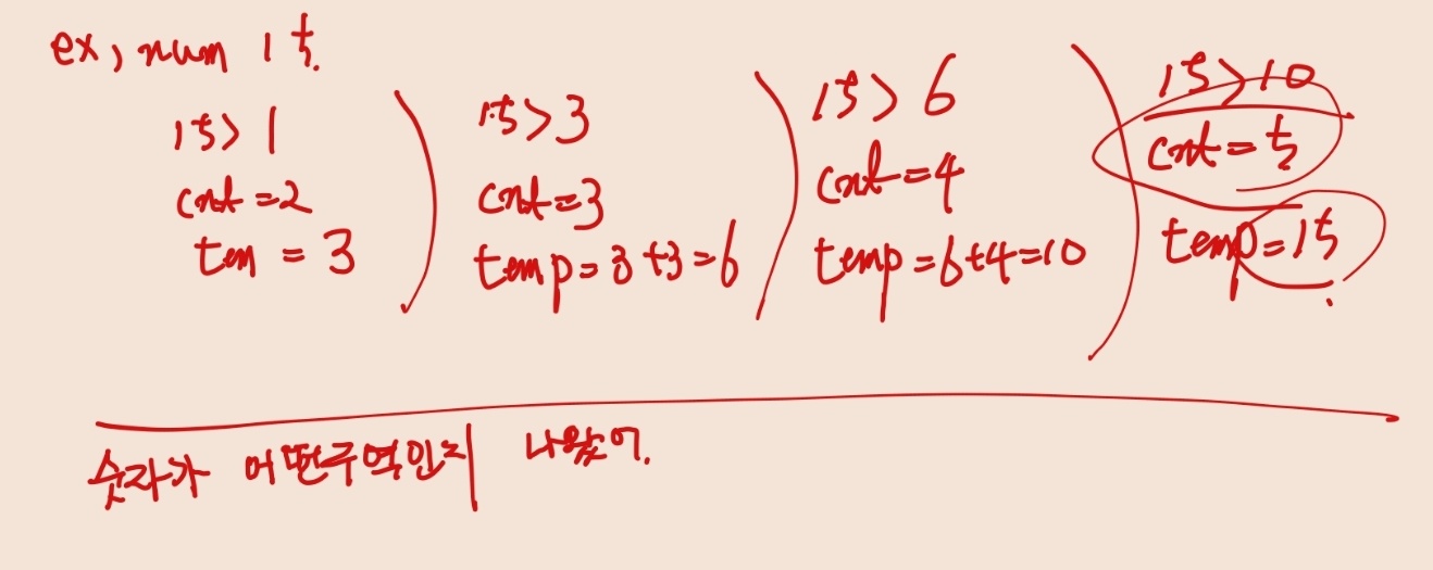 예를 들어, N = 2, 3이면 2구역, N = 4, 5, 6이면 3구역... 이렇게 while문으로 cnt를 구역변수로 구했다.