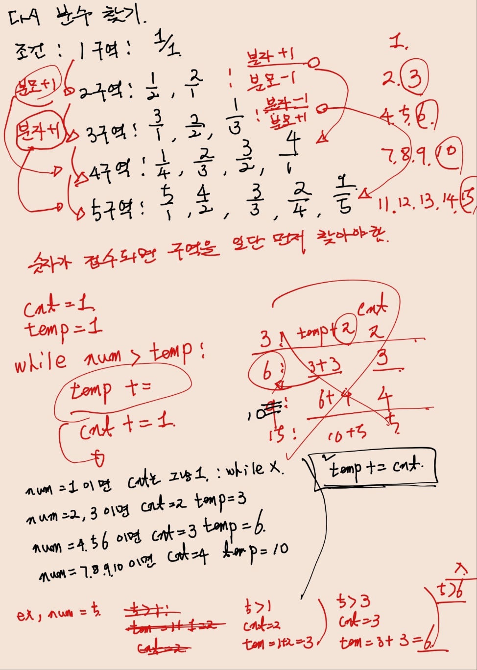 또 각 구역 안에서 각 구역의 개수만큼 짝수일때는 분자 +1, 분모 -1, 홀수일때는 분자-1, 분모+1의 조건을 주었다.