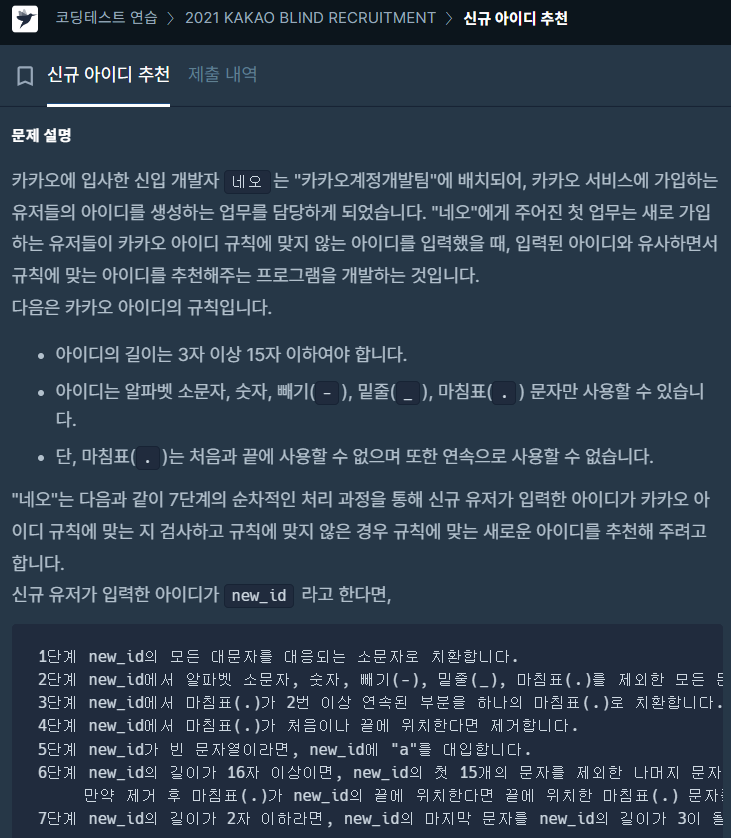대부분의 조건은 문제가 없었으나, 연속되는 마침표를 한개의 마침표로 줄이고, 첫번째와 마지막의 마침표를 제거하는 부분에서 조금 헷갈렸지만 아래의 코드로 해결 할 수 있었다.