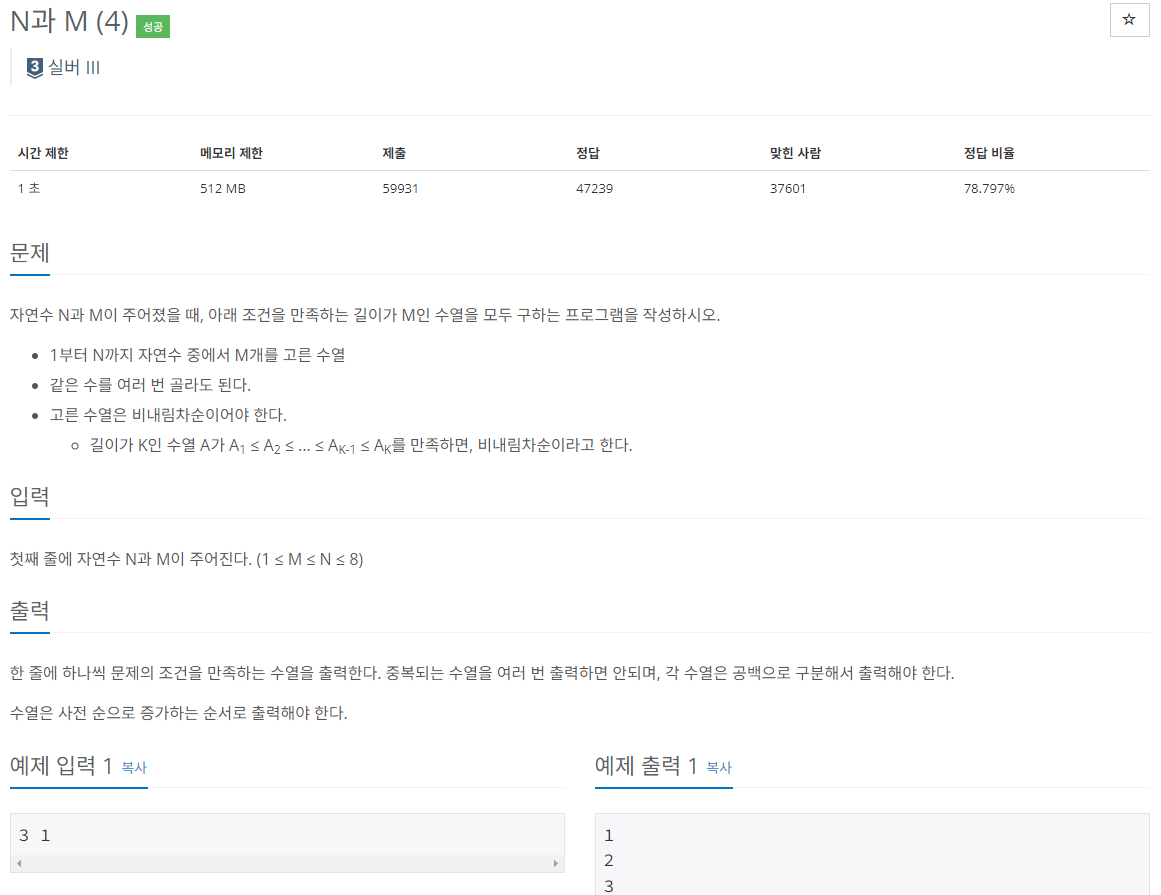 [python_파이썬_Pass]백준_15652번_N과 M(4)_백트래킹_풀이