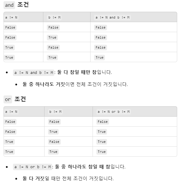 a == N이니까 => answer = [2, 3, 5, 9]이고, b = 2a != N 거짓, b != M거짓이므로 while탈출※나의 and or 정립이 조금 잘못되었다.■ and는 두 조건이 모두 참일 경우에만 참인거다. 즉, a == N 또는 b == M의 조건이 1개라도 맞는 순간 while의 조건은 거짓이 됨으로 탈출한다.■or는 두 조건중에서 1개만 참이어도 참인거다. a == N이지만 b != M이므로 일단 1개만 참이니까 while전체는 참인거고 실행된다. a == N과 b == M이 동시에 된다면 둘다 거짓이므로 while 전체는 거짓이 되어 탈출한다.