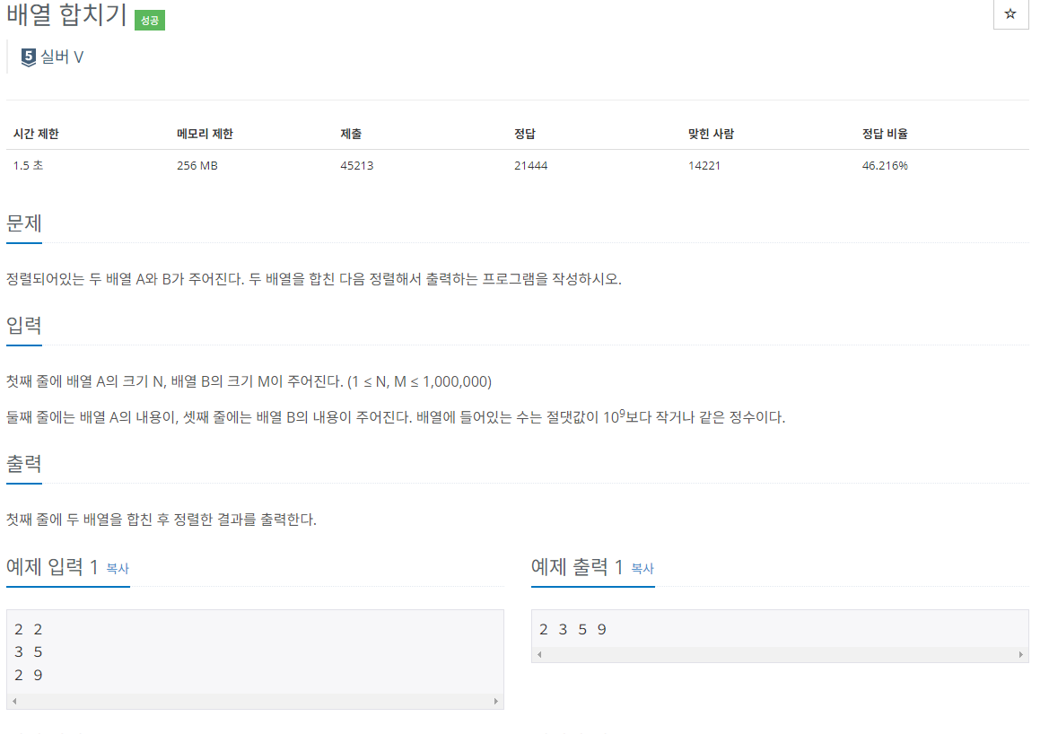 | 투 포인터 | O(N + M) | O(N + M) | 이미 정렬된 두 리스트를 병합 |